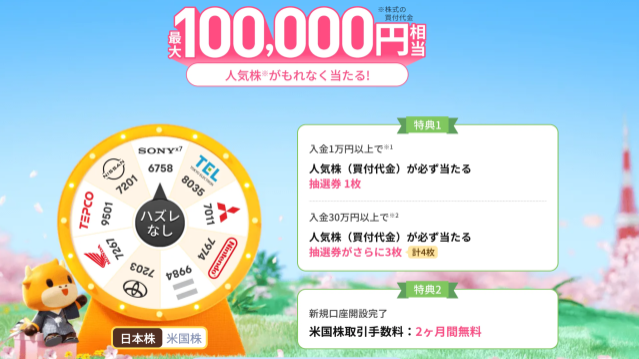 入金30万円以上で人気株(買付代金)が必ず当たる抽選券が3枚(合計4枚)プレゼント!