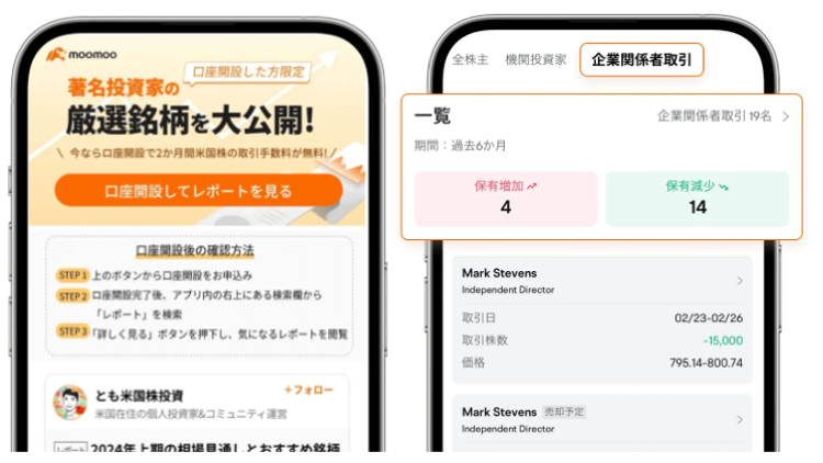 ①著名投資家のレポート&企業関係者取引が閲覧可能!