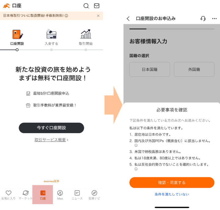 ここからは、moomoo証券に会員登録が済んでおり口座開設をしたい方に向けて手順を紹介します。