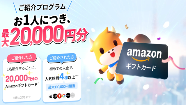 また、現在開催中のキャンペーンは、他の証券会社では中々実施しないキャンペーンの内容になります。入金1万円以上すれば有名銘柄が必ず当たるのも嬉しいポイントです。また、知人を紹介すれば1人あたり2万円分のAmazonギフト券がもらえるのも魅力的でしょう。