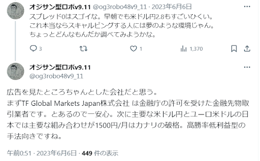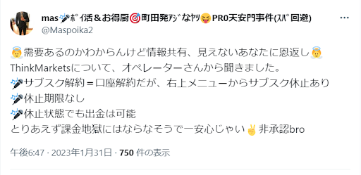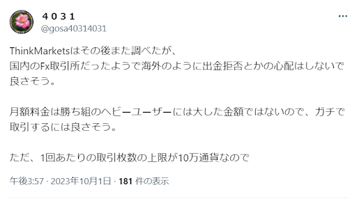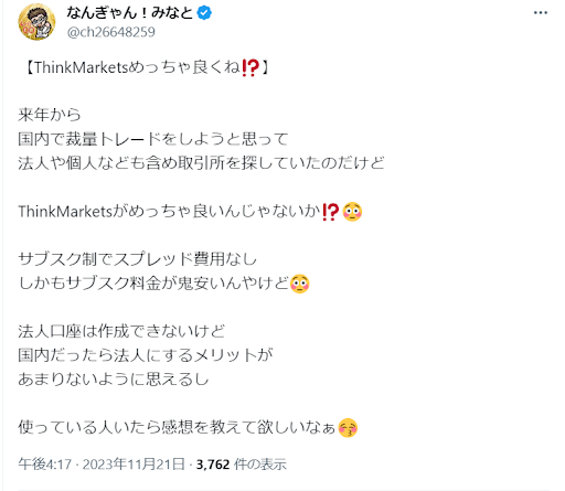 下記は、X(旧:Twitter)で確認できたThinkMarketsの口コミです。